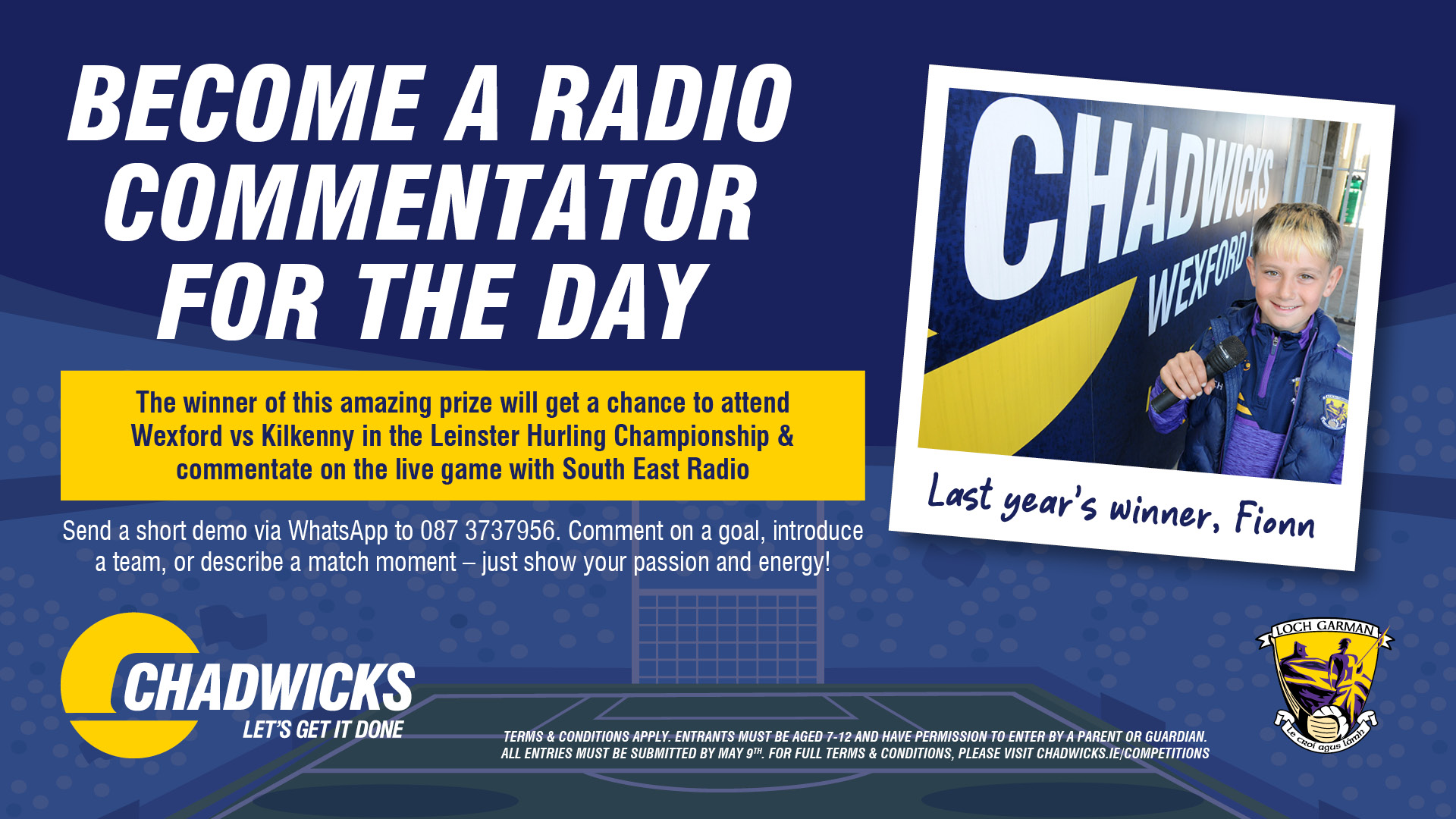 Prize: The prize consists of accompanying the South East Radio commentator at the Wexford vs Kilkenny Senior Leinster Hurling Championship match in Chadwicks Wexford Park on May 25th, 2025. The prize is non-transferable and cannot be exchanged for cash or any other alternative.